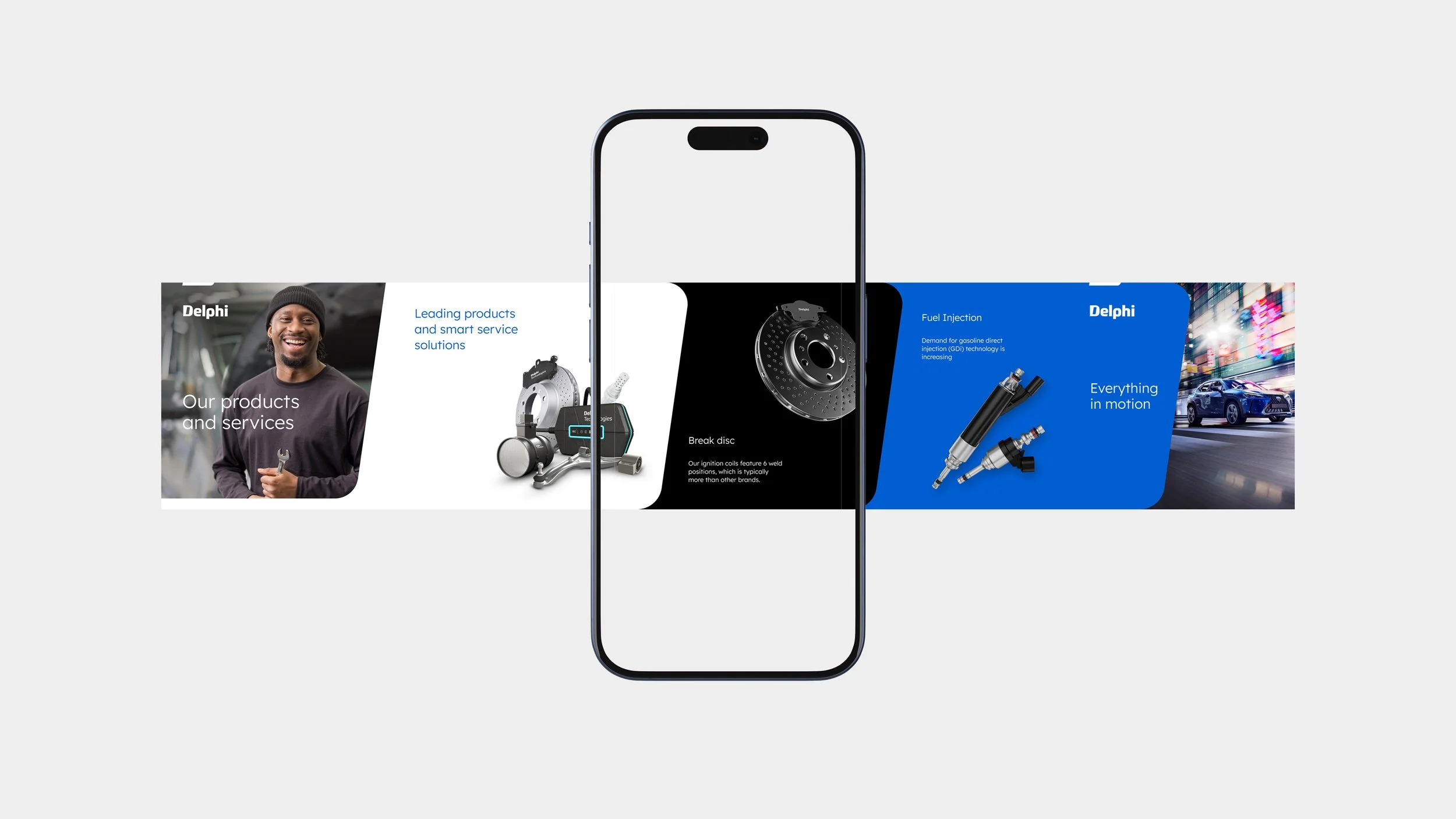 Delphi are the global leaders in aftermarket care, with a network of over 2,750 service centres spanning over 150 countries. With such a large reach they need a design system that can be applied consistently but can also evolve alongside new innovations in their sector. Working with the Delphi brand essence ‘everything in motion’ was the play zone to create new rules and expand the visual toolkit to do just that.